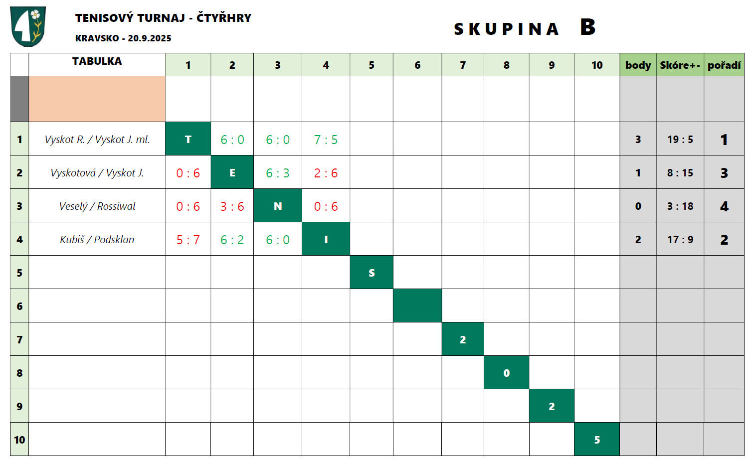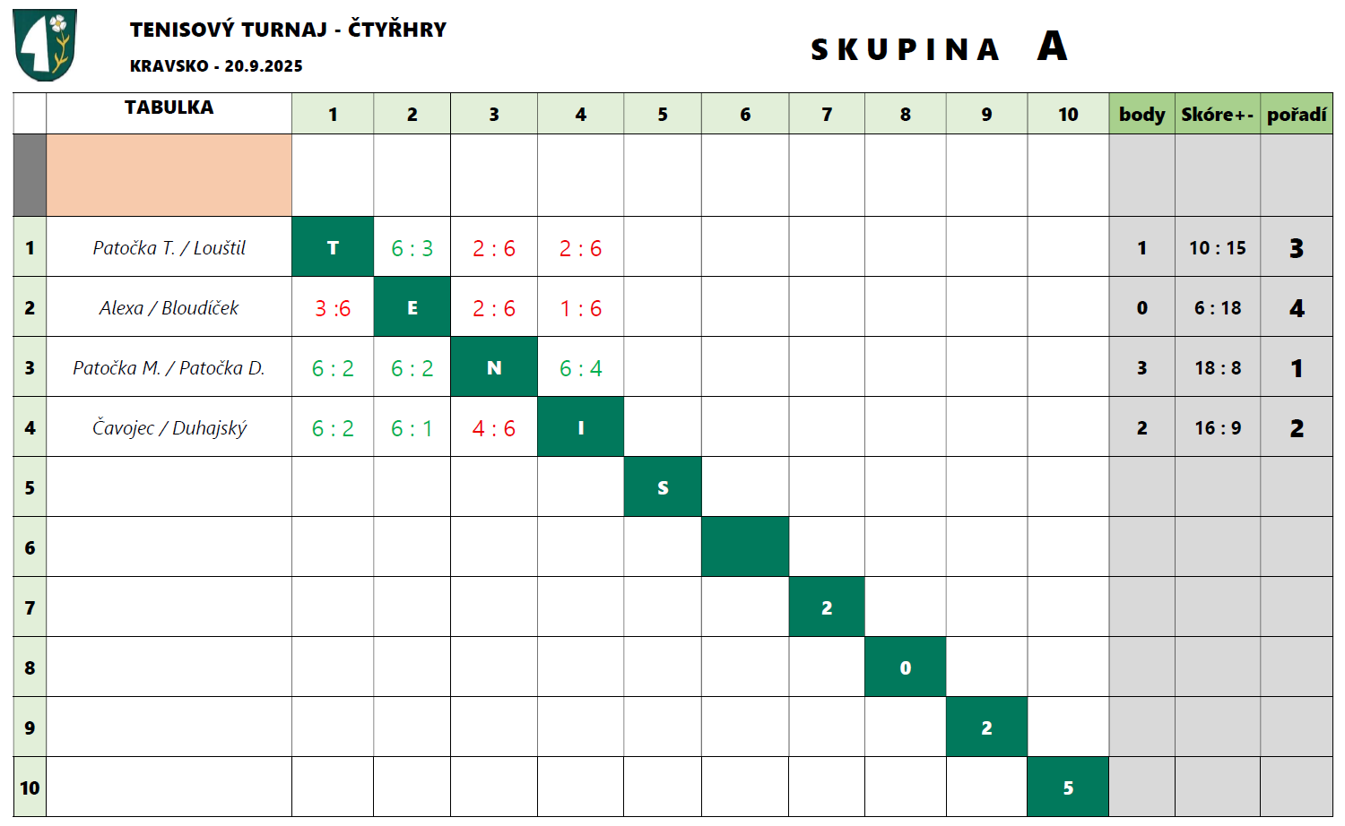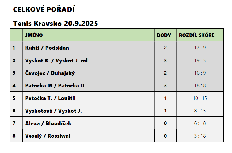 Letošní tenisový turnaj v Kravsku se konal až v září a nebylo čeho litovat, počasí nám vyšlo na jedničku. V sobotu ráno na kurty za školou dorazilo 8 týmů, které pilně trénovaly přes celé léto. Letos jsme pozvali i týmy ze Žerůtek. Po krátkém losu skupin, se rozběhl turnaj, který trval až do odpoledních hodin. Všem účastníkům i fanouškům děkujeme a určitě se sejdeme znovu za rok!